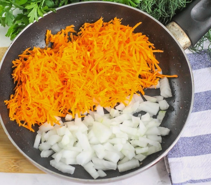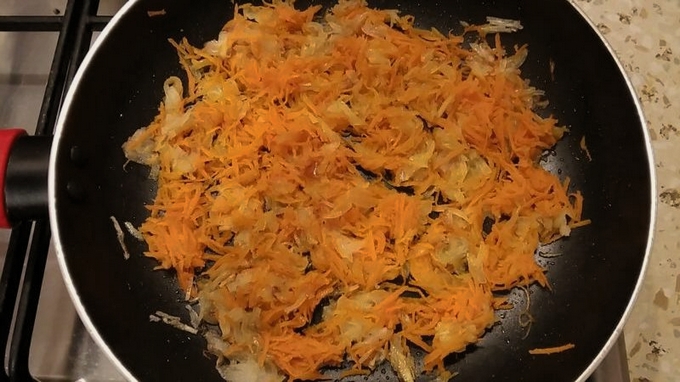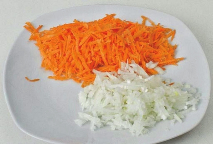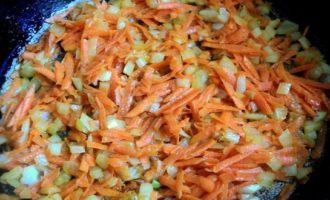 - Hak de ui en wortelen fijn, bak tot ze zacht zijn in plantaardige olie, zout.