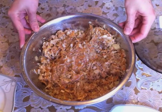 - Kneed het gehakt voor luie koolrolletjes. De componenten: slappe kool, gebakken uien en wortelen, evenals rijst en gehakt.