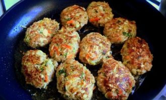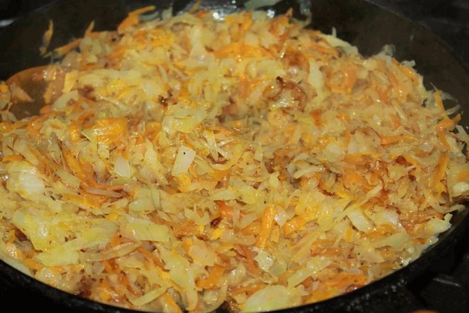 - Hak uien en wortelen fijn en bak ze 5-7 minuten in plantaardige olie, af en toe roerend. Zout het gebraad en kruid het zoals je wilt.