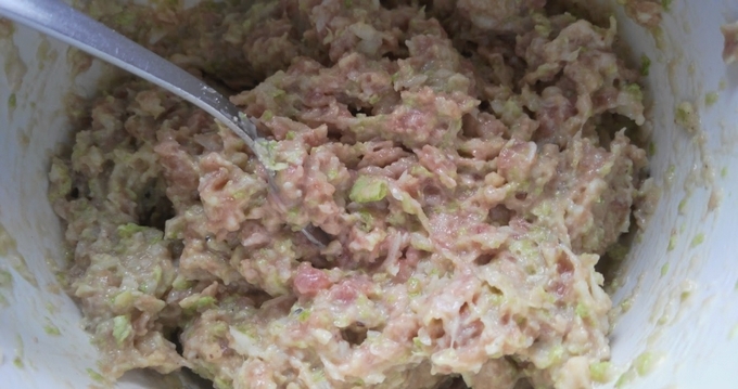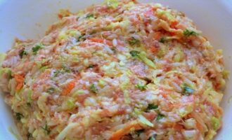 - Voeg gehakte Chinese kool, zout en kruiden toe en kneed in dit stadium het gehakt goed en klop het dan op de bodem van de kom.