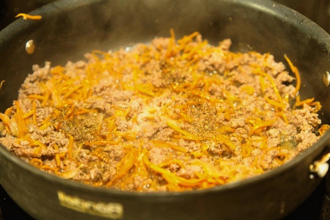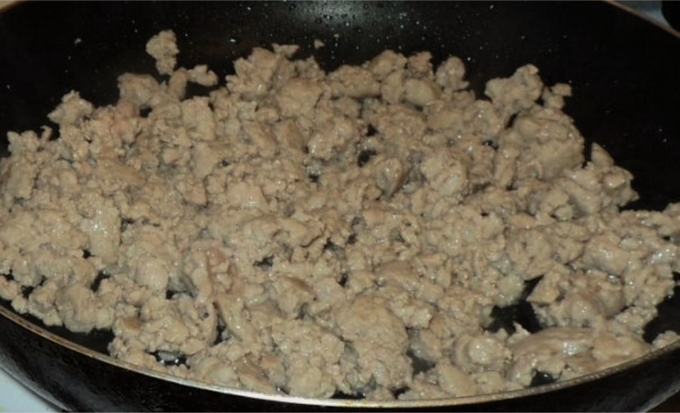 - Bak het gehakt in een pan in hete olie al roerend en breek de klontjes.