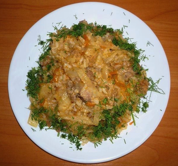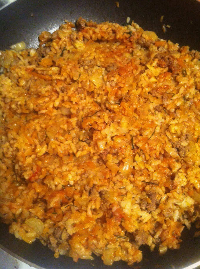 - Wanneer het gehakt van kleur verandert, rijst toevoegen aan de pan, roeren, een beetje water toevoegen en onder het deksel laten sudderen, vergeet niet om daar peperkorrels en een paar laurierblaadjes toe te voegen.
