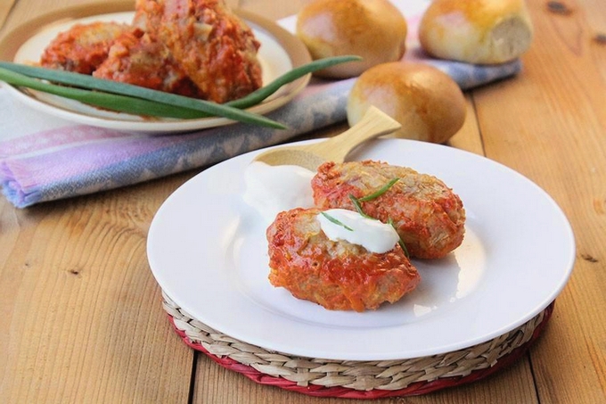 Luie koolrolletjes met schnitzels in tomaten-zure roomsaus zijn een heerlijke volwaardige lunch of diner. Ze zijn goed geïmpregneerd met een geurige saus, daardoor zijn ze mals en zacht. Dergelijke koolrolletjes worden eenvoudig met zure room of met een bijgerecht gegeten, bijvoorbeeld met aardappelen of gekookte pasta.