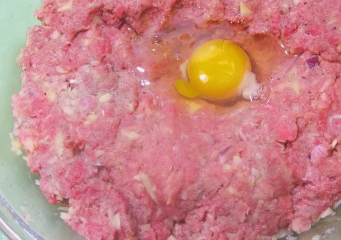 - Voeg naar smaak rauwe eieren, zout, gemalen peper en andere fijngehakte kruiden toe. Kneed het gehakt tot het helemaal glad is.