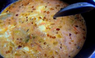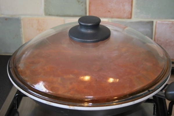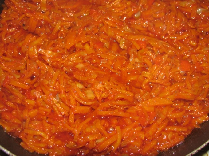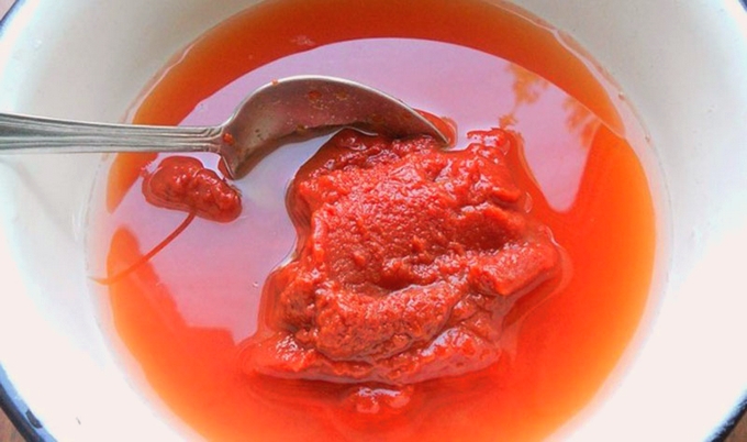 - Roer de tomatenpuree in een glas water, giet het in een koekenpan en laat het gerecht op laag vuur sudderen tot het helemaal zacht is.