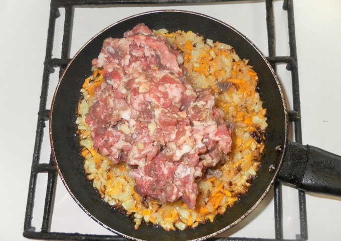 - Voeg tomatenpuree, uien en wortelen toe aan het gehakt in een koekenpan, roer, zout en breng het gehakt op smaak, laat alles samen een paar minuten sudderen onder het deksel.