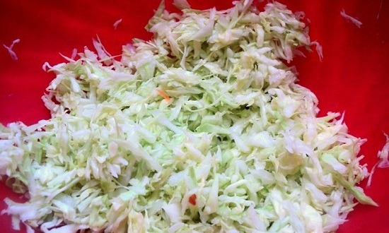 - Kook fijngehakte kool in kokend water gedurende 5-10 minuten, giet het water af.