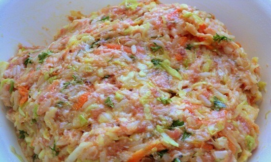 - Kneed het gehakt voor luie koolrolletjes. De componenten: slappe kool, gebakken uien en wortelen, evenals rijst en gehakt.