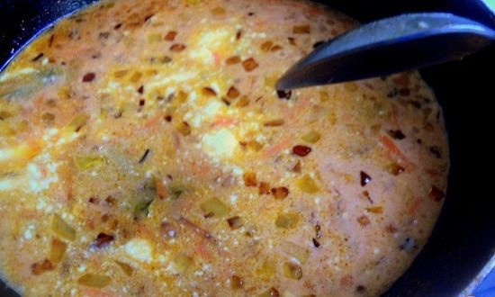 - Voeg zure room, tomatensaus toe aan groenten en roer goed. Je kunt ze op smaak brengen met kruiden en zout.