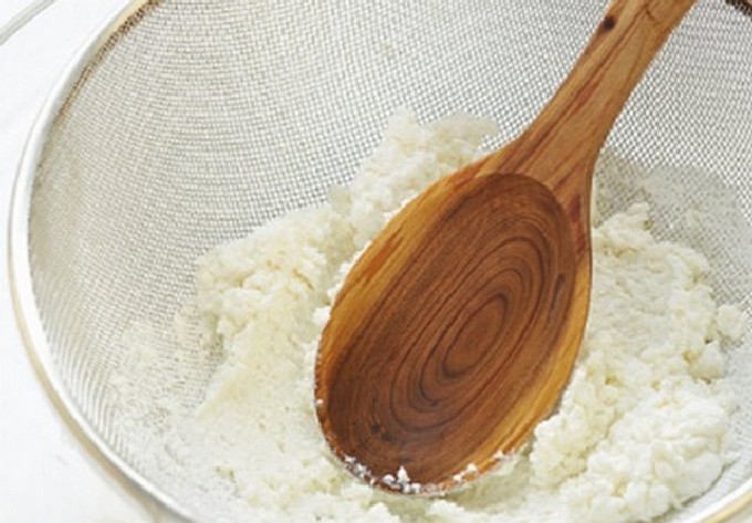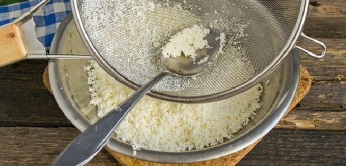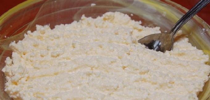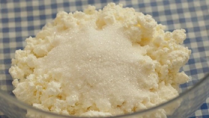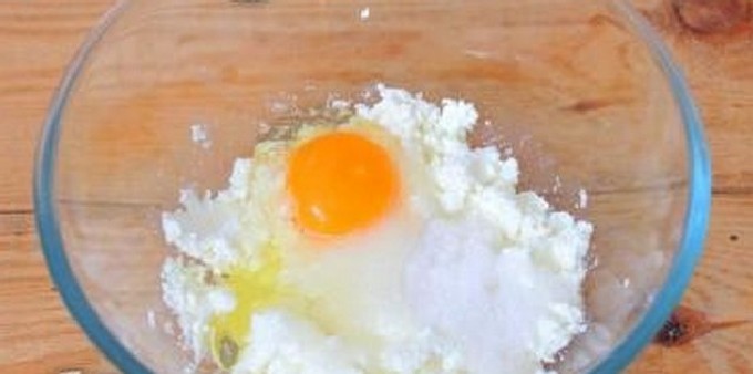 - Geef de wrongel een homogene consistentie door hem door een zeef te wrijven of goed door te kneden met een vork. Als de wrongel vloeibaar is, knijp hem dan uit de wei. Klop het ei los met suiker en zout, voeg toe aan de wrongelmassa en roer goed door.