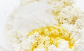Smelt de boter, voeg toe aan de wrongel. Klop vervolgens de eieren in dezelfde kom, voeg zout en suiker toe.
