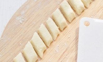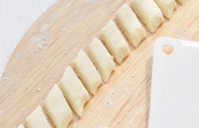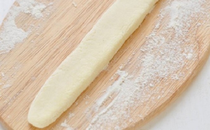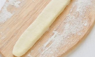 - Vorm op een tafel of op een snijplank kleine worstjes van het deeg en snij ze vervolgens in diamanten, zoals op de foto.