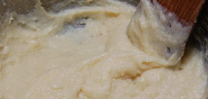 - Vervolgens wordt de kokende melk van het vuur gehaald, wordt er een glas gezeefde bloem aan toegevoegd en wordt de basis voor het deeg snel en goed gekneed met een houten spatel om een gladde en glanzende klont te krijgen.