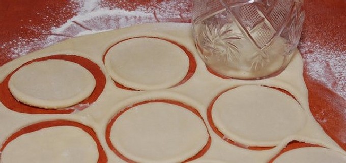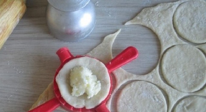 - Rol het deeg uit en steek ronde blanco's uit de laag, waarop vervolgens een volle theelepel vulling wordt gelegd. Maak mooie knoedels.