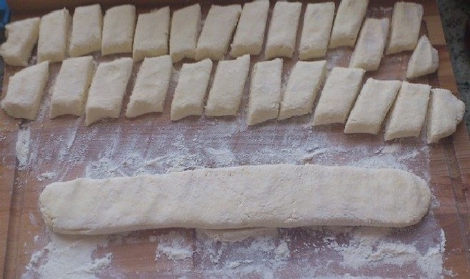 - Verdeel het deeg in verschillende gelijke delen, rol elk deel in worsten, die dan een beetje naar beneden moeten worden gedrukt en in gelijke diamanten moeten worden gesneden.