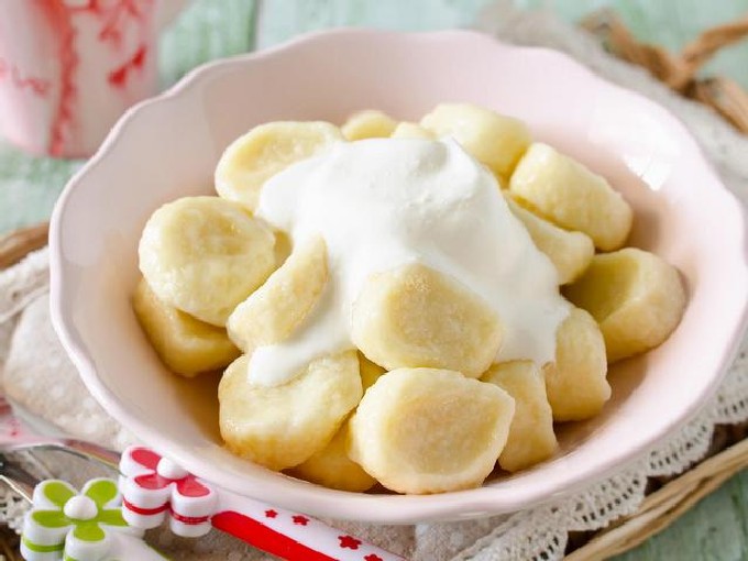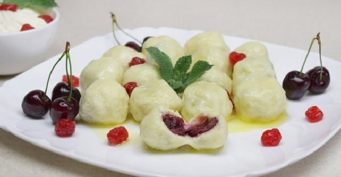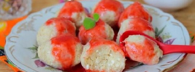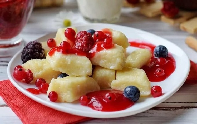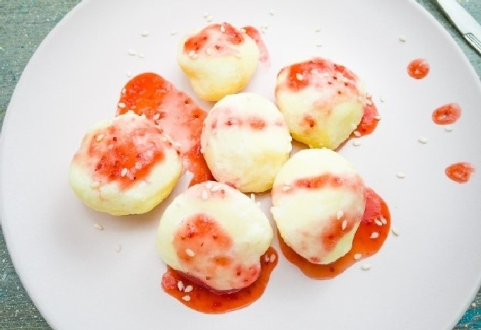 - Dumplings van kwark en havermout moeten warm worden geserveerd, met een schuimspaan uit de pan gehaald. En ze eten ze met jam, zure room of boter.