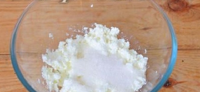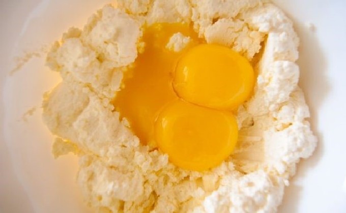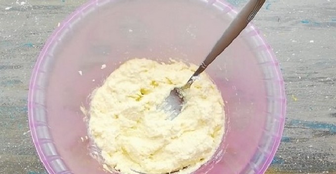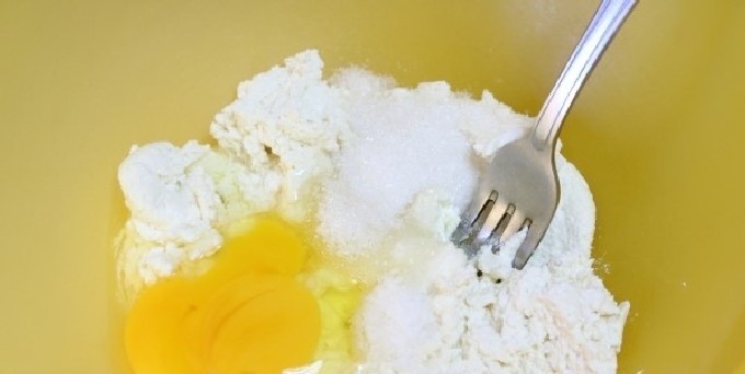 - Pureer de kwark met een vork of wrijf door een zeef, voeg zout, suiker en een ei toe.