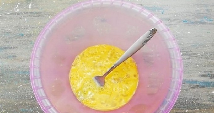 - Breek het ei in een grote kom en roer het met een vork glad.