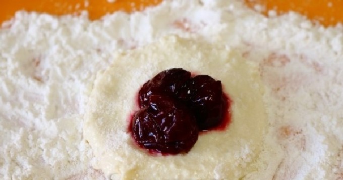 - Bestrooi een tafel of een grote snijplank met bloem, leg het deeg daar, verdeeld in kleine klontjes van gelijke grootte. Rol elk klontje in een nette dunne ronde pannenkoek, plaats in het midden een theelepel van de vulling (verwijder de pitjes van de kersen en laat het sap uitlekken, roer met suiker en zetmeel).