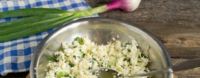 - Roer voor de vulling de cottage cheese door de puree (is het erg hard, maak de puree dan dunner door nog wat melk toe te voegen). Voeg naar smaak zout, gemalen zwarte peper toe aan de vulling, en je kunt ook dille of groene uien hakken en toevoegen.