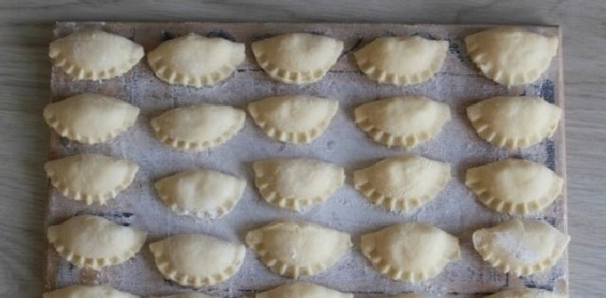 - Rol het deeg dun uit tot een laag, rol de cirkels uit, voeg de vulling toe en vorm knoedels van elke vorm (op de foto hebben ze de vorm van ronde ballen).