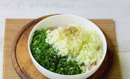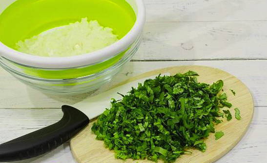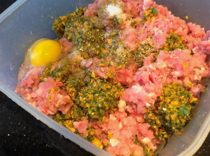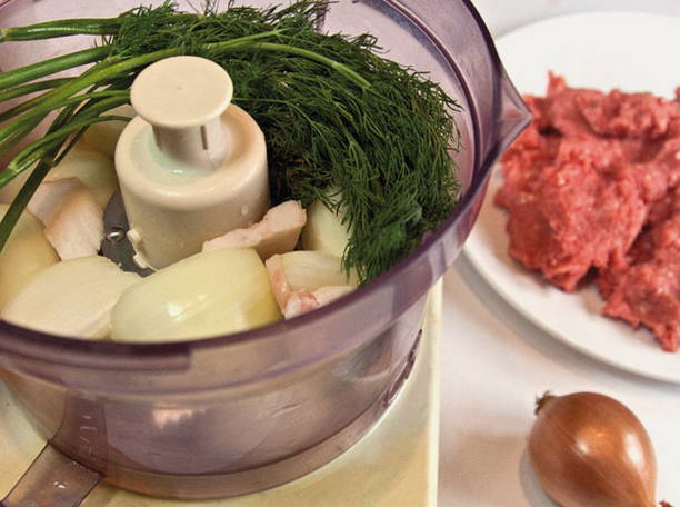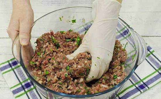 - Meng het gehakt met de ui-knoflookmassa, voeg zout, kruiden en citroensap toe. Het gehakt moet met de handen worden gekneed tot een homogene, stroperige consistentie is verkregen en een half uur in de koelkast bewaren.