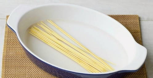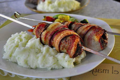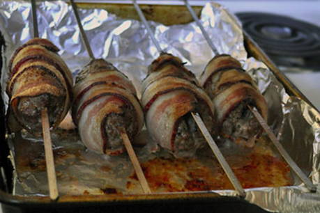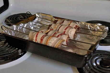 - Neem een vorm met hoge randen, bedek deze met folie. Wikkel elke spies in een reepje spek. Plaats de kebab over de container.