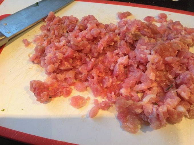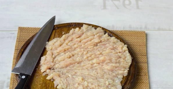 - Hak het kippenvlees heel fijn of hak het in een blender.
