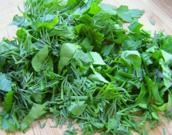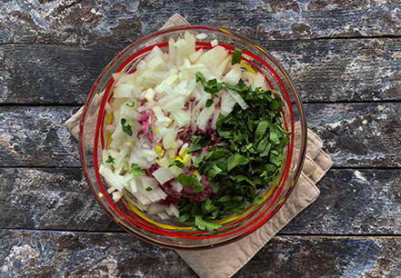 - Was de greens en hak ze fijn met een mes, voeg de greens toe aan het gehakt.