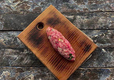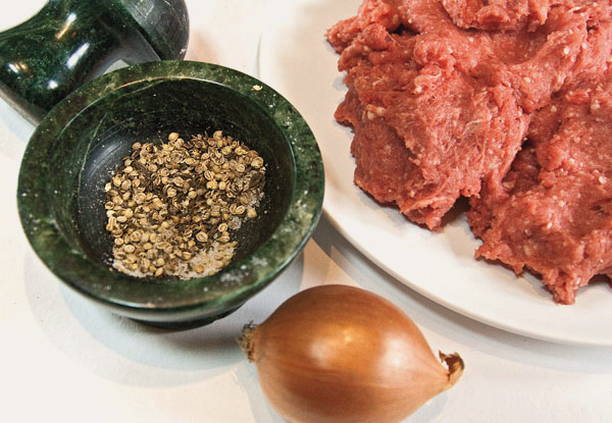 Rol het vlees samen met reuzel en uien door een vleesmolen. Zout het gehakt en breng op smaak.