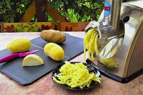 - Koel gekookte aardappelen, schil en rol door een vleesmolen samen met vet staartvet.