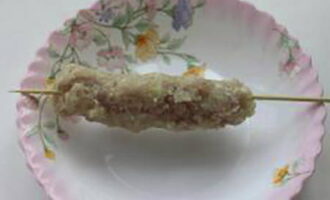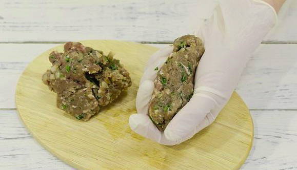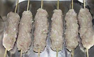 Vorm van het verkregen gehakt kleine worstjes en leg ze op spiesjes.