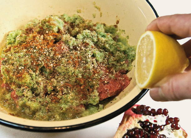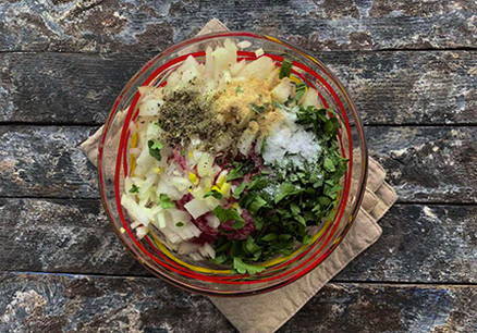 - Meng in een kom het gehakt, de gesnipperde ui, knoflook, basilicum, koriander en cayennepeper. Zout de massa naar smaak en kneed met je handen ongeveer 4-5 minuten.