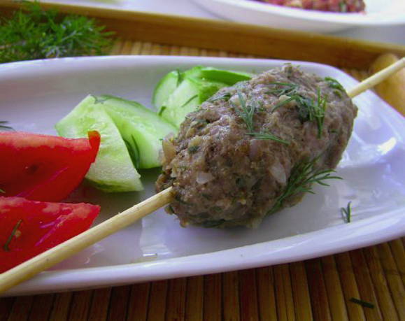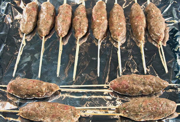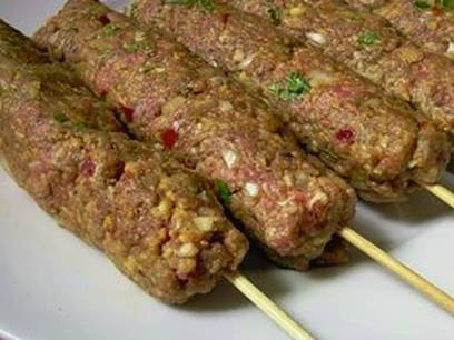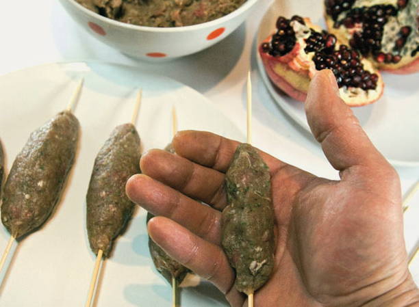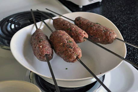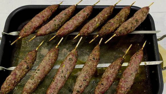 - Zout gehakt naar smaak, voeg citroensap toe en kneed goed. Leg het gehakt daarna een half uur in de koelkast. Week de spiesen vooraf in water, plak er met natte handen het gehakt op en vorm er dunne worstjes van.