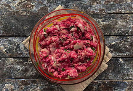 - Meng het rundergehakt met ingelegde uien en koriander, zout en breng op smaak.