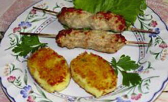 Aardappelgerechten hoeven geen bijgerecht bij het hoofdgerecht te zijn. Voor elke gelegenheid presenteren wij u een licht vegetarische versie van kebab. Dit gerecht kan onafhankelijk worden geserveerd door er groentesalade of zure room-knoflooksaus aan toe te voegen.