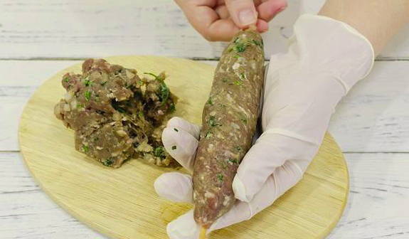 - Voeg zout en kruiden toe aan het gehakt, kneed het grondig met je handen, het moet dicht en homogeen worden. Verdeel het gehakt in stukken en plak deze om de houten spiesen, plet het gehakt goed met je handen en vorm er langwerpige worstjes van.