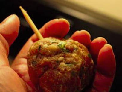 - Verdeel daarna het gehakt in kleine porties, vorm de worstjes met natte handen en steek ze op houten spiesen.