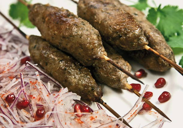- Serveer hete lula-kebab met ingelegde uien en groenten.