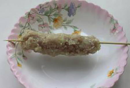 - Fixeer het gehakt op bamboestokken en vorm er langwerpige worstjes van.