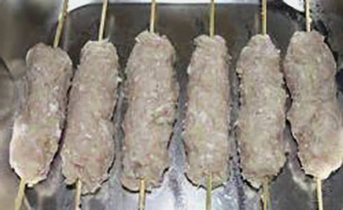 - Zout gehakt naar smaak, voeg citroensap toe en kneed goed. Leg het gehakt daarna een half uur in de koelkast. Week de spiesen vooraf in water, plak er met natte handen het gehakt op en vorm er dunne worstjes van.