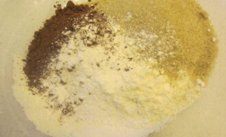 - Meng in een diepe kom de gezeefde bloem met cacao, bakpoeder en suiker.
