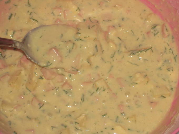 - Klop voor het deeg de eieren los met melk, bloem, zout, peper en bakpoeder. Roer de worst erdoor met kaas.