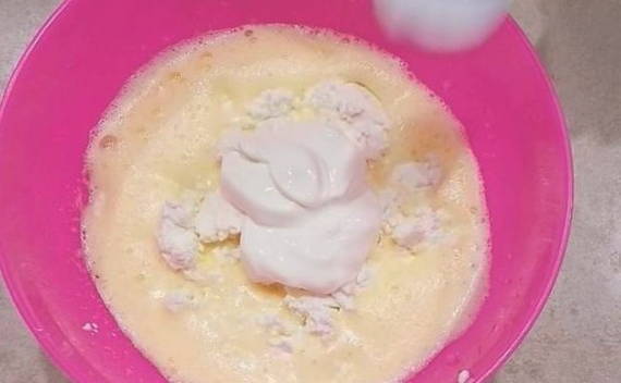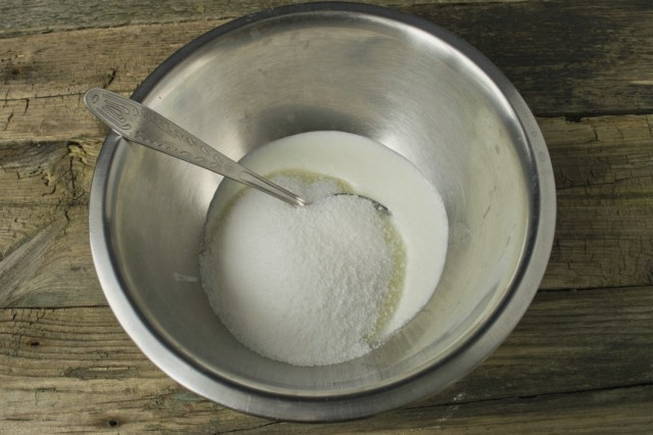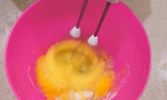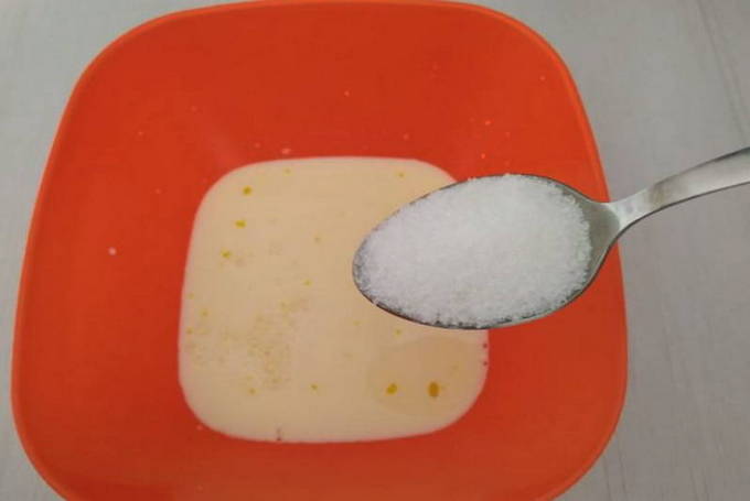 - Combineer eieren in een diepe kom met suiker en zout. Klop de producten met een mixer.
