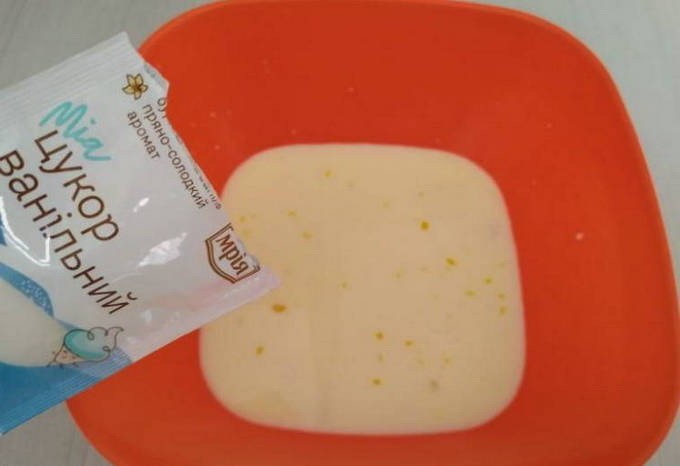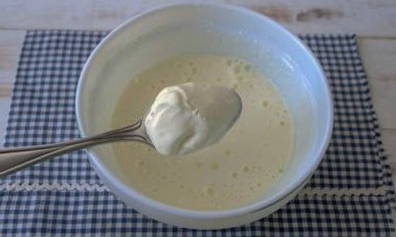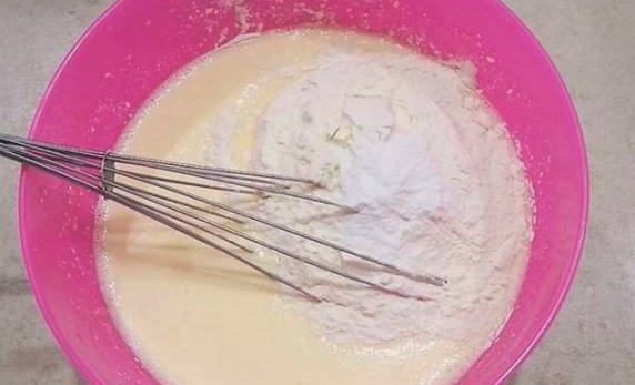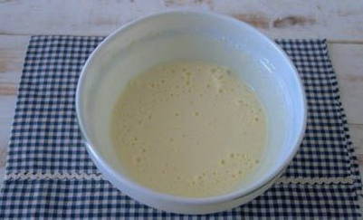 - Klop twee eieren, een dooier, melk, zout en suiker in een diepe kom.
