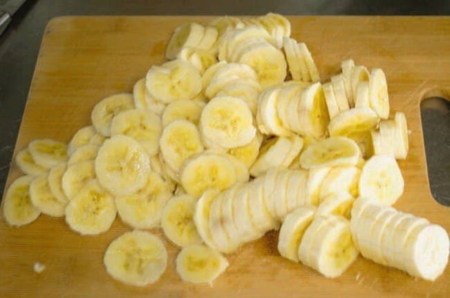 - Schil de bananen en snijd ze in kleine stukjes.