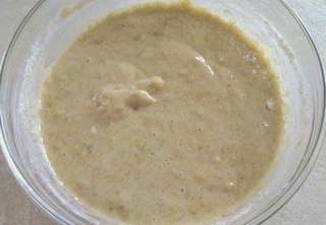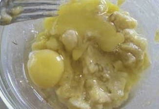 - Doe de bananen in een diepe kom en kneed ze met een vork samen met de kippeneieren.