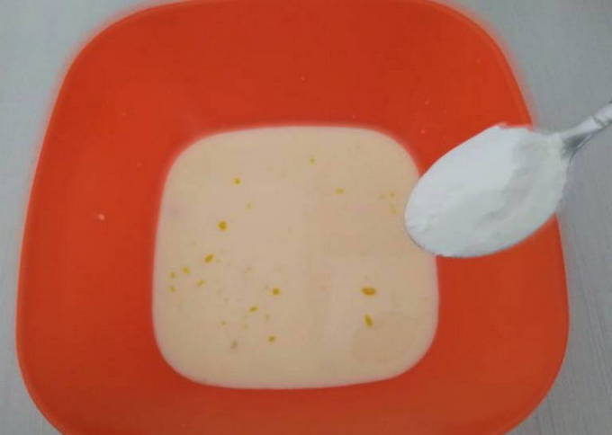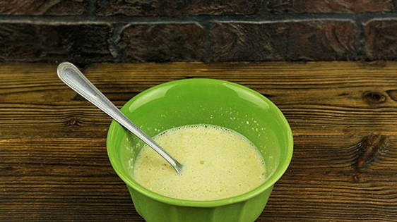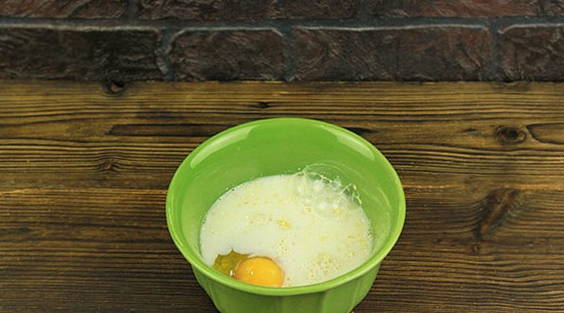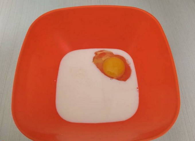 - Giet melk in een diep bord en voeg hier een kippenei toe.