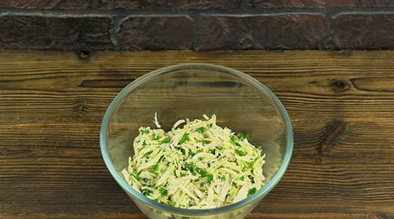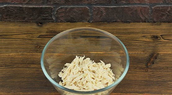 - Kook de kipfilet gaar en verdeel deze in kleine stukjes. We zetten het op een apart bord.