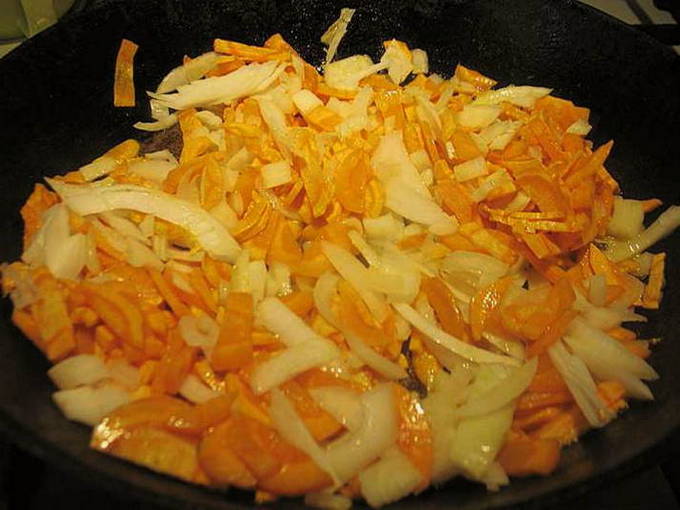 - Voeg gesnipperde uien toe aan de groente. Kook nog 2-3 minuten.
